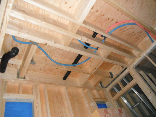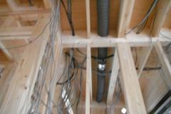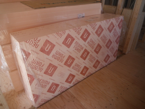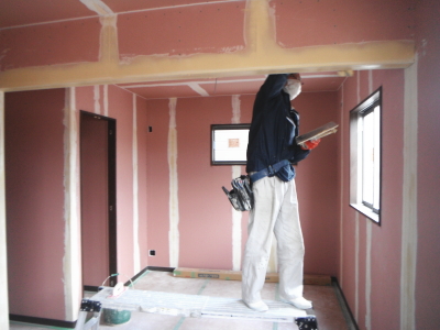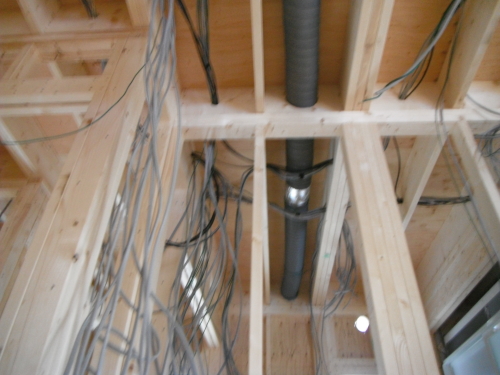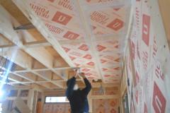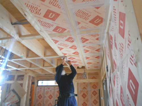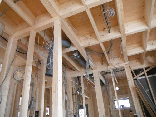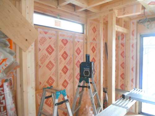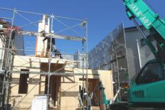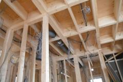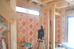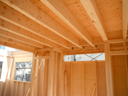 ツーバイフォーの躯体工事は、基礎⇒1階床⇒1階壁⇒2階床⇒2階壁⇒屋根というふうに下から順次上に完成させていきます。木造軸組工法では、壁の筋交(壁に斜めにいれる木)が邪魔をして断熱材が入りにくく隙間ができやすくなりますが、ツーバイフォーの場合は、スタッドという縦の枠材だけなので隙間無く壁がフレーム一体型の構造パネルになり、断熱材も隙間なく入れやすい材木配置となります。