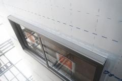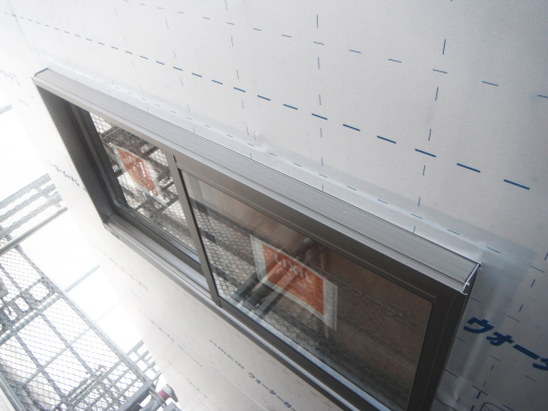 注文住宅では、外壁は自由に選べます。スズカハウスでは、実物のサンプルを取り寄せて最終決定をして頂きます。家を守る上で、外壁の役割は重大です。雨、風、太陽光、温度、湿気、音を外からできる限り遮断して、室内の環境を保つ役割があります。中でも水を遮り躯体の木へ水気が入らないようにする必要があります。写真の透湿防水シートは、内側からの湿気を外に出し、外側からの水の侵入を遮断する役目を持っています。窓廻りには三重の防水対策となるように、シートの下に防水テープを貼っています。