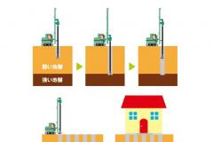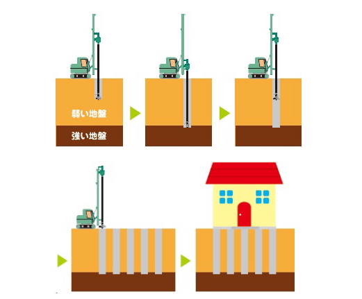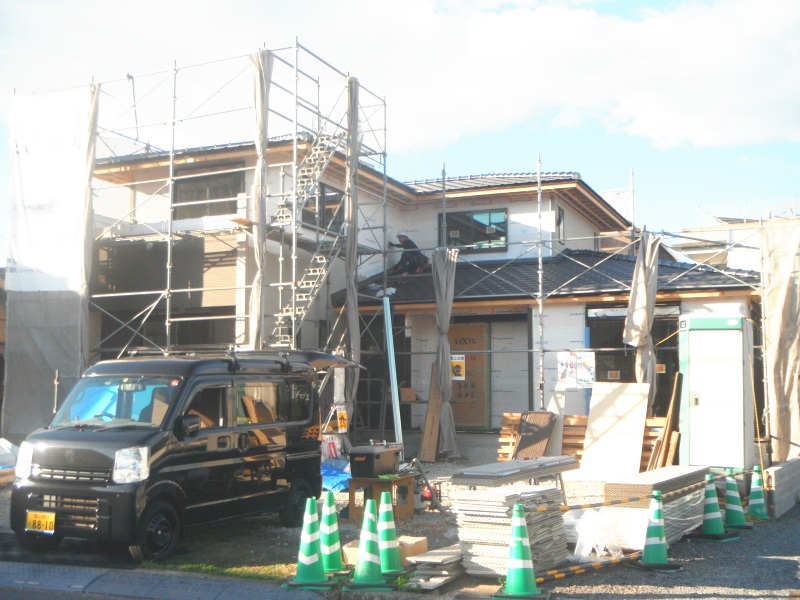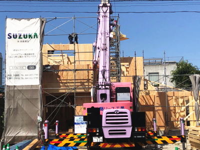 | 工事着工 柱状改良 基礎工事 外部配管工事 | 躯体建て方(棟上げ) 電気の打合せ 屋根工事 | 配線工事 外壁工事 断熱工事 内部造作 ユニットバス設置 | 内部仕上げ工事 |