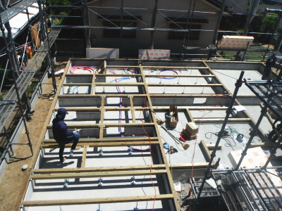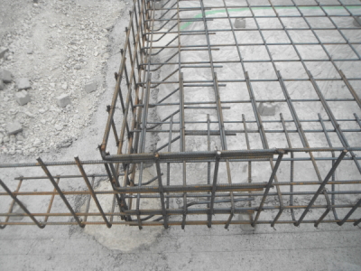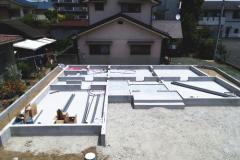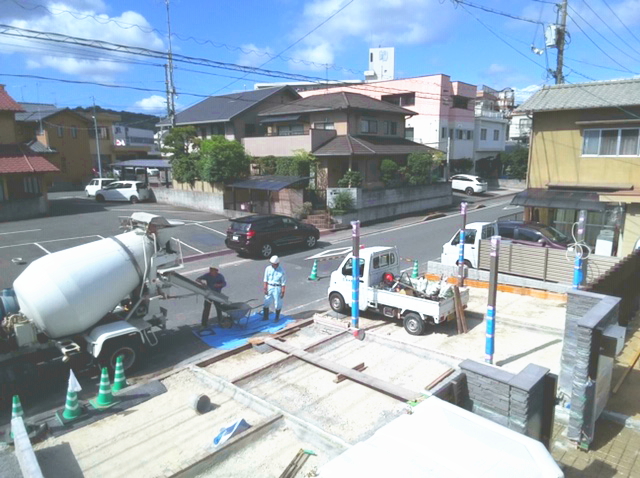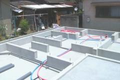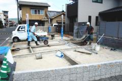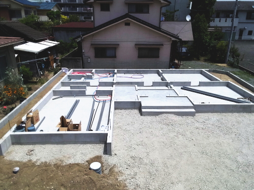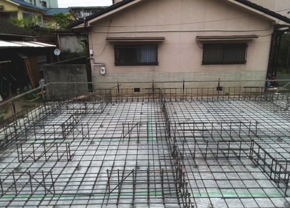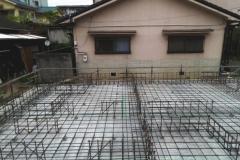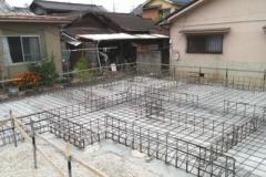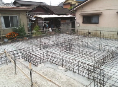 鉄筋は、厚みの中央に入って、コンクリートの中心にくるように配置をしておくことが大切です。いわゆるかぶり厚がないと鉄筋コンクリートの強度がでないからです。配筋(鉄筋を並べること)完了後、社内検査、および第三者検査機関の検査を受けます。第三者検査機関の検査は、住宅瑕疵担保保証の保険を受けるために必要です。コンクリートを打ち終えたら、コンクリートが硬化するまでそのままで養生をします。 -
