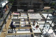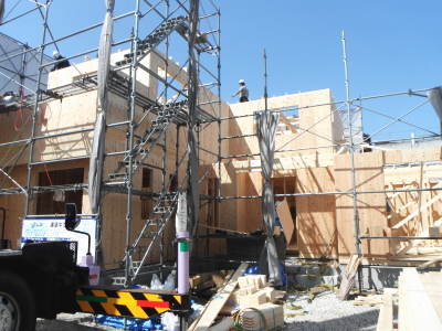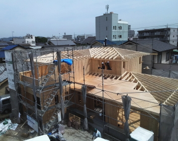 ツーバイフォーは、基礎⇒1階床⇒1階壁⇒2階床⇒2階壁⇒屋根というふうに下から順次上に完成させていきます。壁・床は、頑強に金物やボルト・釘で、接合されるので、横からの力に対しても、在来工法の2.5倍以上も強いといわれています。