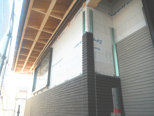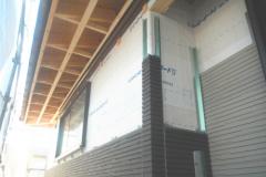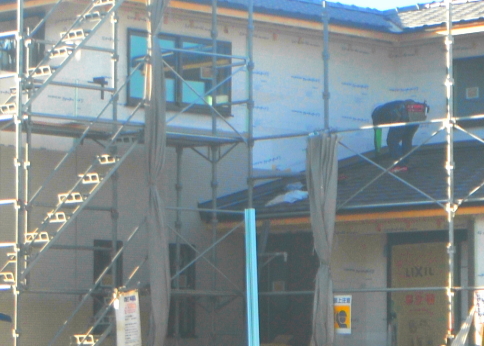 写真の白いシートは、サイディング下地の防水透湿シートです。このシートは、外からの水と湿気が内に入るのをシャットアウトし、中から外への湿気は、通過できるという優れものです。サイディング下の通気層は、構造体と外壁材の間に通気層という流通空気層をつくり、負圧にして下地防水シート内の滞留した湿気を空気層に放出する仕組みになっています。