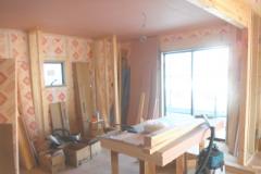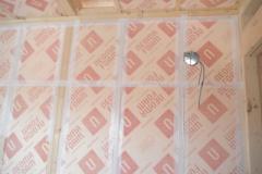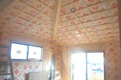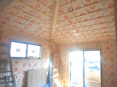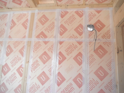 壁・天井(屋祢下)に断熱材を隙間なく入れます。部屋内から壁に湿気が入らないように、テープで隙間がないようにします。断熱材は、万が一の湿気にも強いボード(旭化成のフェノール樹脂ボード ネオマフォーム t=60mm)を使用しています。