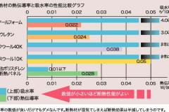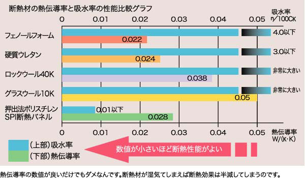 スズカハウスの断熱材は、フェノール樹脂です。フェノール樹脂は、断熱材の中では最も熱伝導率が低く、ウレタンよりも高い断熱性能で、グラスウールと比べると2倍の高性能です。吸水率も低いため、グラスウールのように湿気や水分を含んで収縮することもありません。また、熱硬化型の樹脂なので火災にも比較的強い断熱材です。