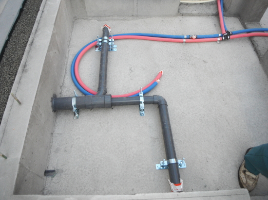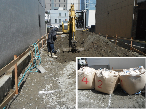 重りの重さを変えながら、回転数を記録して地盤の強度N値を算出し、数字が大きければ大きいほど強度が高いことの証明となります。地盤調査の結果、深度深くの地盤は十分強く安定していましたが、1-2mの表土が多少弱い箇所があったため、基礎工事の前に表土の地盤改良工事をおこないました。所定の高さまで表土を取り除き、石灰粉と土を混合して地盤自体を固める作業を行います。 -