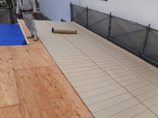屋根の下地の防水フェルトは、経年変化が少ないポリエチレン素材で高い防水性を持った防水素材です。