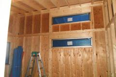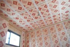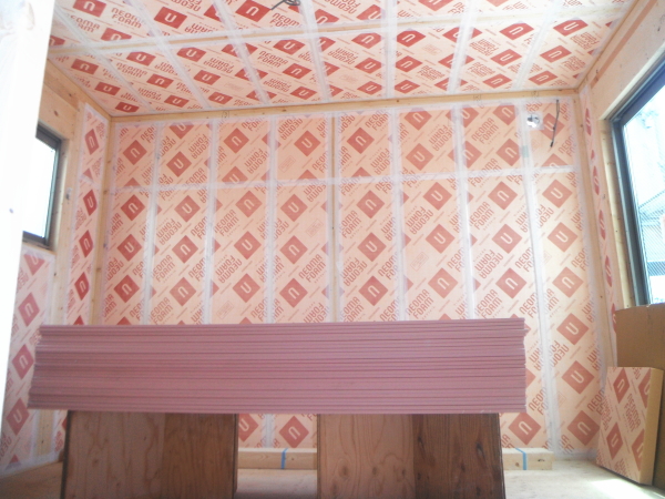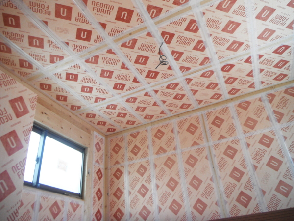 壁・天井(屋祢下)に断熱材を隙間なく入れます。部屋内から壁に湿気が入らないように、テープで隙間がないようにします。断熱材は、万が一の湿気にも強いボード(旭化成のフェノール樹脂ボード ネオマフォーム t=60mm)を使用しています。