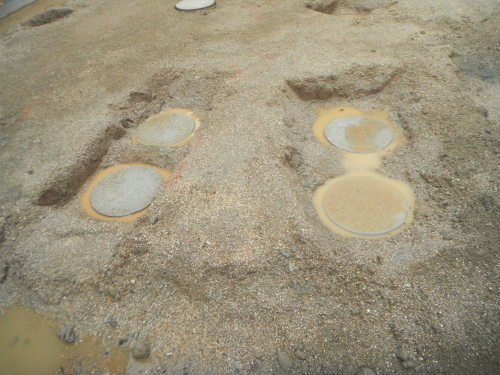 予定通りに深層地盤改良(セミパイル)による地盤補強を行いました。径 40cmの大きさを 4~4.5mの深さで行います。写真は、アースドリルで地面に穴を掘り込み、スラリーを注入しているところです。