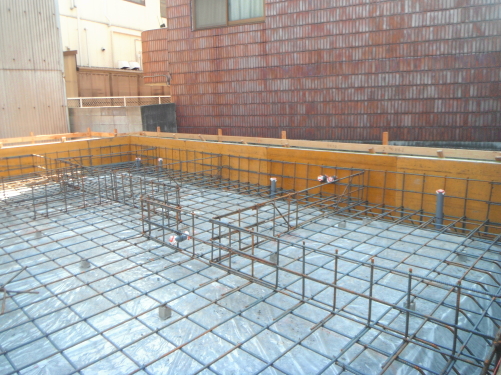 配筋(鉄筋を並べること)完了後、社内検査、および第三者検査機関の検査を受けます。第三者検査機関の検査は、住宅瑕疵担保保証の保険を受けるために必要です。