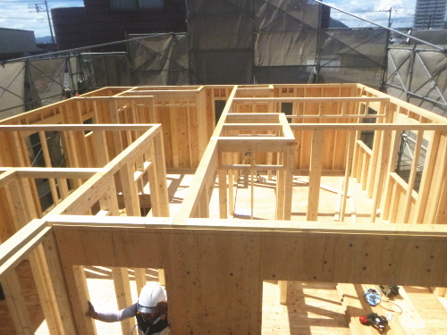 ツーバイフォーは、基礎⇒1階床⇒1階壁⇒2階床⇒2階壁⇒屋根というふうに下から順次上に完成させていきます。壁・床は、頑強に金物やボルト・釘で、接合されるので、横からの力に対しても、在来工法の2.5倍以上も強いといわれています。