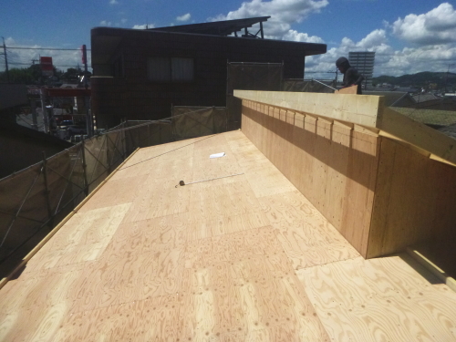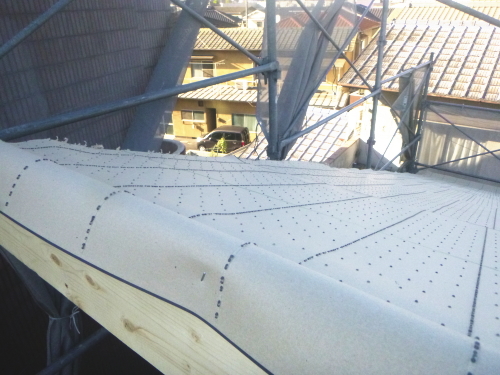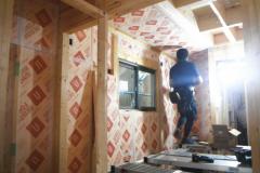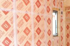 防水シートは、万が一に外壁材から侵入した水を躯体内部に入れない役目があります。また、窓周りは、特に水の浸入を絶対に防ぐために、防水テープをしっかりと取り付けます。