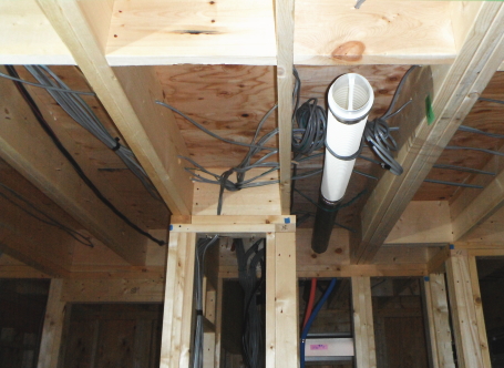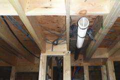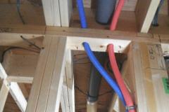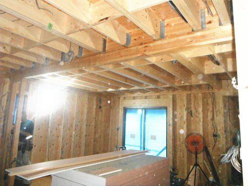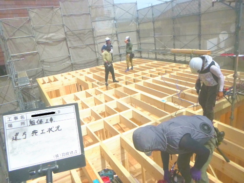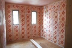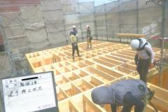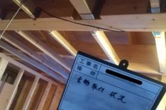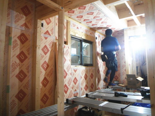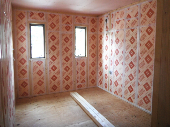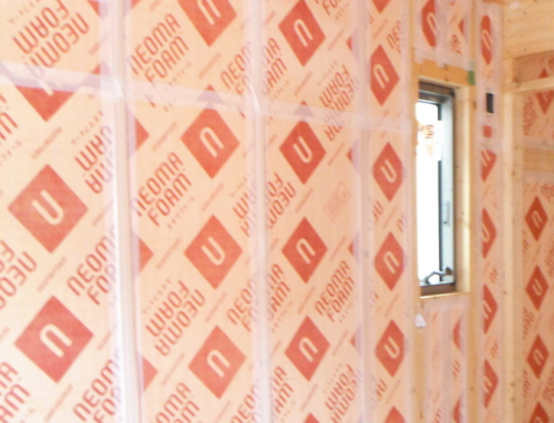 1階床下根太の間には、写真のように断熱材(フェノール樹脂ボード)を隙間無くいれます。また、壁内や天井にも、断熱性が高く水に強い高性能のフェノール樹脂板 t=60mmを入れ、家をポットのように熱を逃がさない構造に仕上げます。