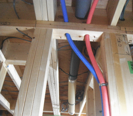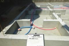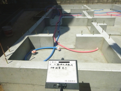 基礎工事が終わると、給排水配管工事を行います。勾配を確認しながら、念入りに配管を組み合わせて埋め戻します。 -