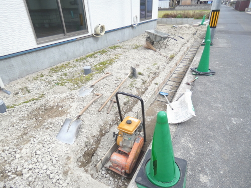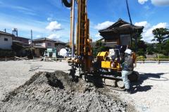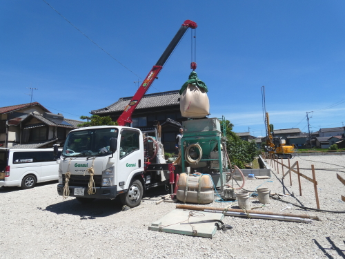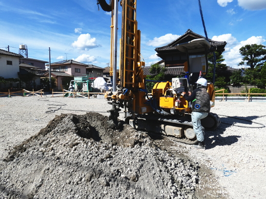1.地盤調査結果、柱状改良工事による地盤補強をすることとなりました。アースオーガーなどで掘削した孔に、掘削した土砂とセメント系固化材を混合した土を埋戻し、オーガーの正転、逆転によて攪拌、締固めを行い、柱状の改良体を形成する工法です。セメント系の粉体固化材を使用します。セメント系固化材は粘土質やシルト質、砂質などの軟弱土を水和反応によって科学的に固化させるもので、高含水で有機物を含有する軟弱土に有効な材料です。