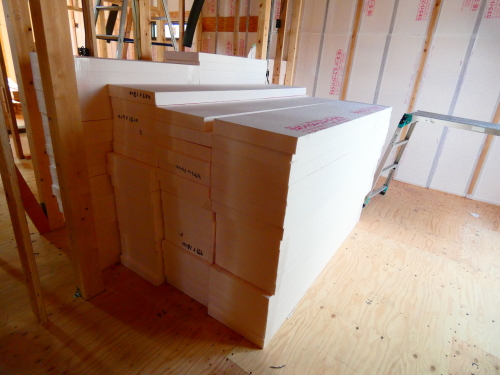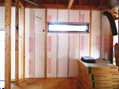 断熱材は、カネライトフォームです。天井も壁も65mm厚を入れます。独立気泡の小さな泡の中に気体を閉じ込め、熱伝導の三要素として知られる熱の「対流・輻射・伝導」の数値を小さく固定できる安定した断熱材です。独立気泡が熱をさえぎり、結露も抑制します。独立した気泡構造により、断熱の大敵である水が入りにくく、断熱性能の劣化を防いでいます。フロン及びPRTR法対象物質の発泡剤としての使用を撤廃し、ホルムアルデヒドも含まれておりません。 また、マテリアルリサイクルも可能で、グリーン購入法にも適合しています。
