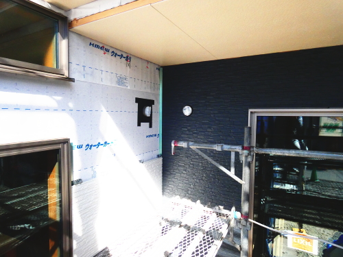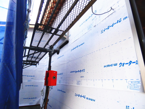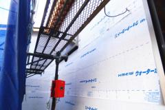 防水シートは、万が一に外壁材から侵入した水を躯体内部に入れない役目があります。また、窓周りは、特に水の浸入を絶対に防ぐために、防水テープをしっかりと取り付けます。
