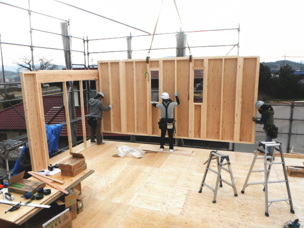 ツーバイフォーは、2×4の材に構造用の耐水合板を打ち付けた耐力壁と壁と同様の作りの剛性の床板の壁式工法。基礎⇒1階床⇒1階壁⇒2階床⇒2階壁⇒屋根というふうに下から順次上に完成させていきます。写真のように、工場で予め壁構造体を部分的に組み立てて、現場で組み上げるやり方は効率もよく、精度も上げられるので標準的な工事手順となります。(現場によっては、現場で壁を材木から組み立てます。)剛接合により床壁などを完全に固定するので、建物の変形は基本的にありません。