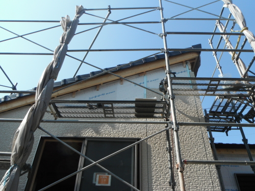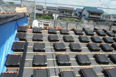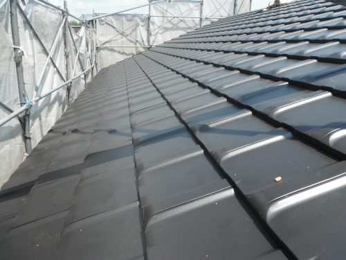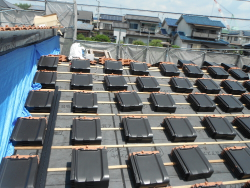 屋根の下地は、構造用合板の上に防水のフェルトシートを設置して、防水フェルト下地に瓦桟を取付、瓦を一枚づつステンレスのビスで取り付けます。洋瓦の焼成瓦です。耐水性・耐震性・断熱性にすぐれ長期にわたって品質や色が衰えません。
