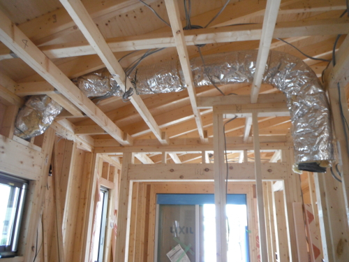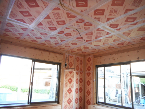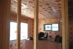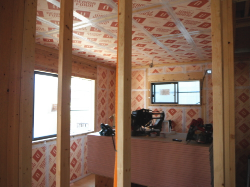 外壁は、通気工法のサイディング仕上げです。防水透湿シートは、外からの水と湿気が内に入るのをシャットアウトし、中から外への湿気は、通過できるという優れものです。サイディング下の通気層は、構造体と外壁材の間に通気層という流通空気層をつくり、負圧にして下地防水シート内の滞留した湿気を空気層に放出する仕組みになっています。さらに室内側も気密を施工すると壁体内結露を防げます。